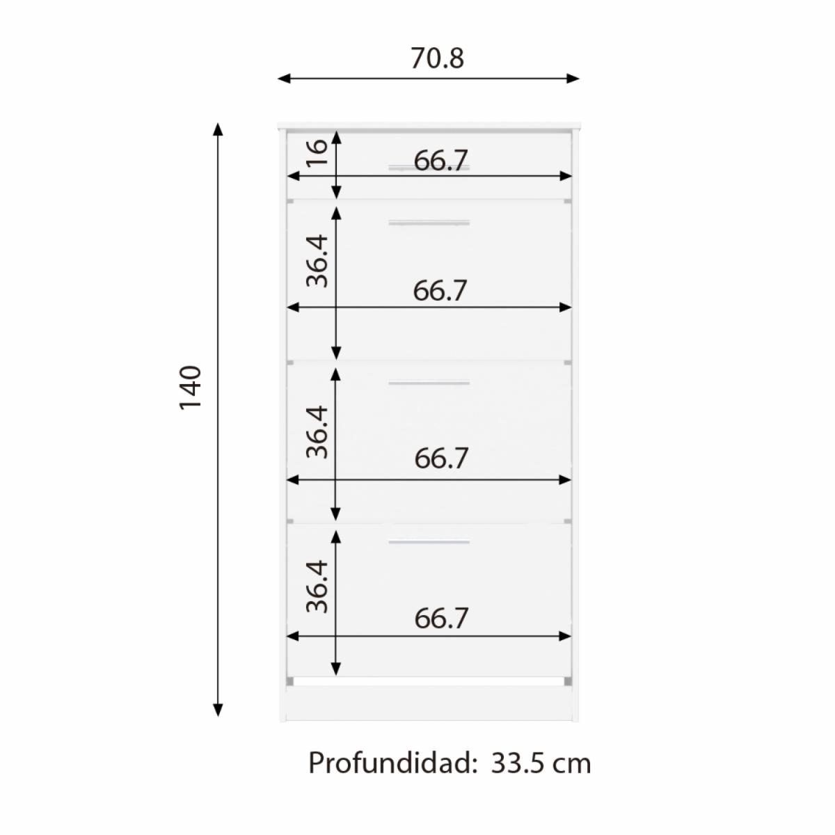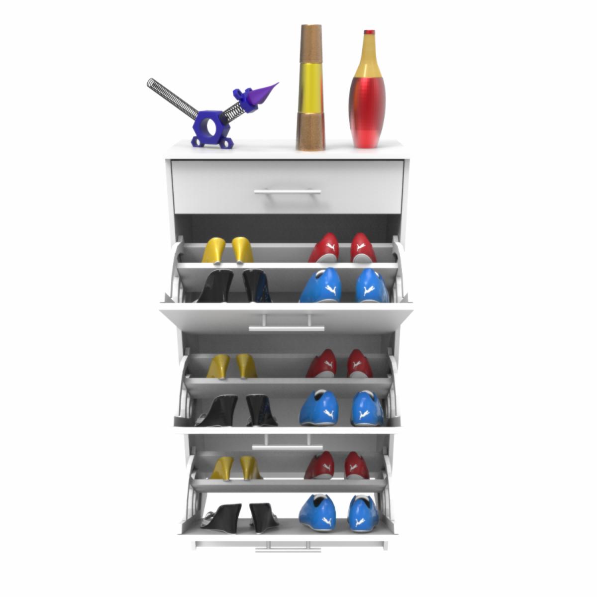 • Contiene un cajón superior con un juego de rieles de extensión mini de 30 cm que soporta hasta 10 kg, mantiene tres puertas para acceder a el area de zapatos cada uno tiene un juego de herrajes para zapato para facil organizacion cada uno soporta hasta 3 kg, la accesibilidad de cada espacio cuenta con una tiradera gris de 128 mm, en su base se encuentran deslizadores negros de 15 mm para el correcto desplazamiento del mueble